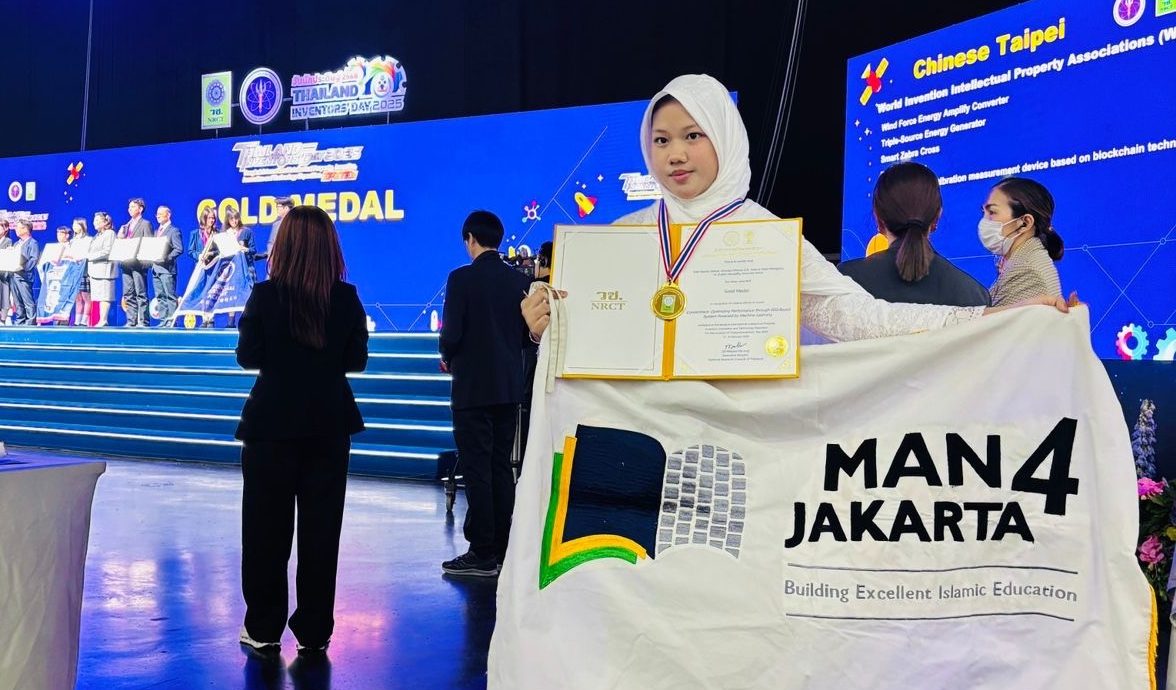 MAN 4 Jakarta Selatan (08/02/2025) –Prestasi riset internasional kembali dipersembahkan oleh siswi MAN 4 Jakarta, Ghaniya Khansa Zahira Azalia. Ghaniya bekerjasama dengan siswa MAN Insan Cendikia Serpong berhasil meraih medali emas dalam ajang Thailand Inventors Day 2025, sebuah kompetisi penelitian bergengsi yang diselenggarakan oleh National Research Council of Thailand (NRCT) dan Ministry of Higher Education, Science, Research and Innovation. Acara ini berlangsung pada 2-6 Februari 2025 di Bangkok International Trade & Exhibition Center.