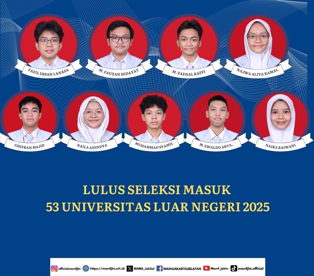 MAN 4 Jakarta Selatan (23/03/2025) – Sebanyak delapan siswa MAN 4 Jakarta berhasil diterima di 53 perguruan tinggi luar negeri melalui jalur mandiri pada tahun 2025 ini. Keberhasilan ini menunjukkan bahwa madrasah mampu mencetak lulusan berkualitas yang siap bersaing di tingkat global. Pencapaian ini merupakan hasil dari ketekunan para siswa serta bimbingan intensif dari guru, wali kelas, dan tim Bimbingan Konseling (BK) yang secara aktif memberikan pendampingan dalam proses pendaftaran.