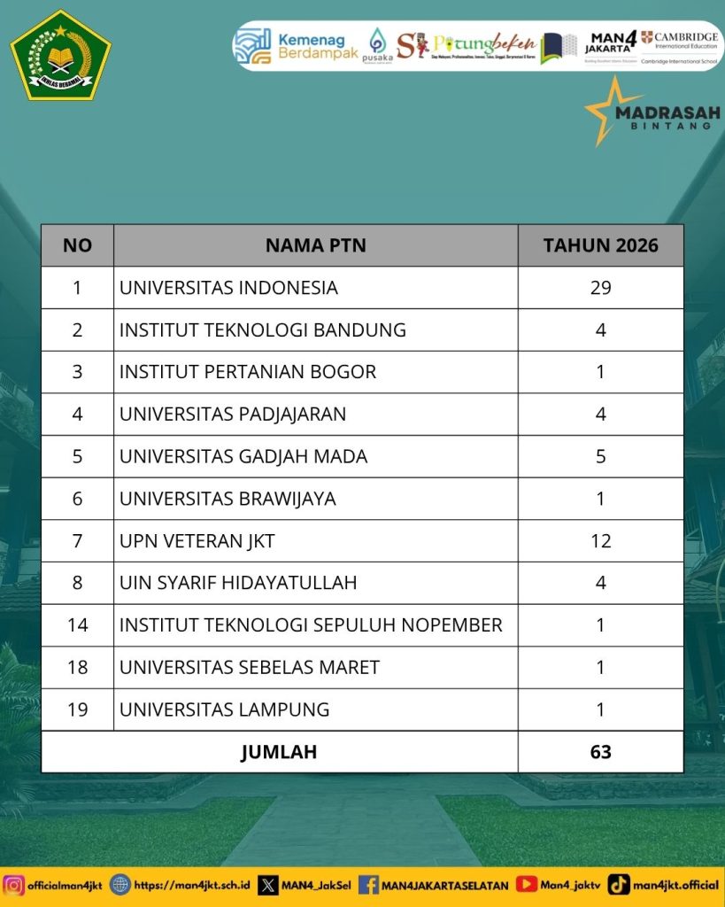 Tidak hanya itu, beberapa murid lainnya juga berhasil diterima di berbagai kampus top nasional lainnya seperti Universitas Brawijaya, IPB, ITS, Universitas Lampung dan UNS. Hal ini semakin menunjukkan bahwa murid MAN 4 Jakarta Selatan mampu bersaing secara nasional.