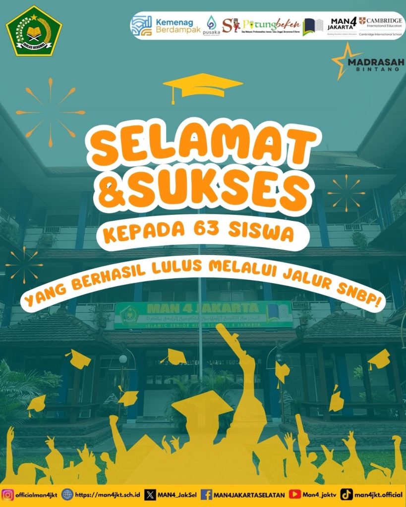 Dengan capaian 63 murid lolos SNBP di PTN favorit, MAN 4 Jakarta Selatan kembali menegaskan komitmennya sebagai madrasah unggulan yang mampu mencetak generasi berprestasi dan berdaya saing tinggi. Prestasi ini diharapkan dapat menjadi motivasi bagi para murid lainnya untuk terus berusaha meraih mimpi dan melanjutkan pendidikan di perguruan tinggi terbaik di Indonesia.